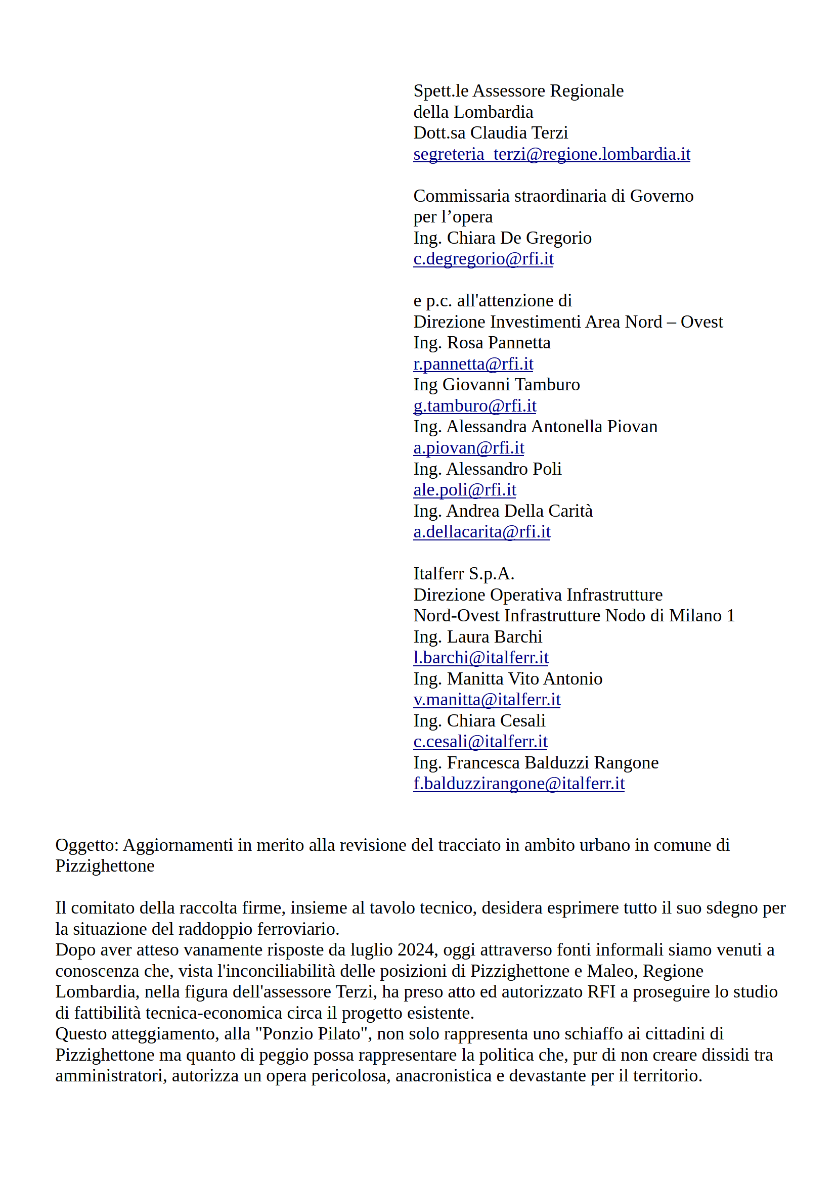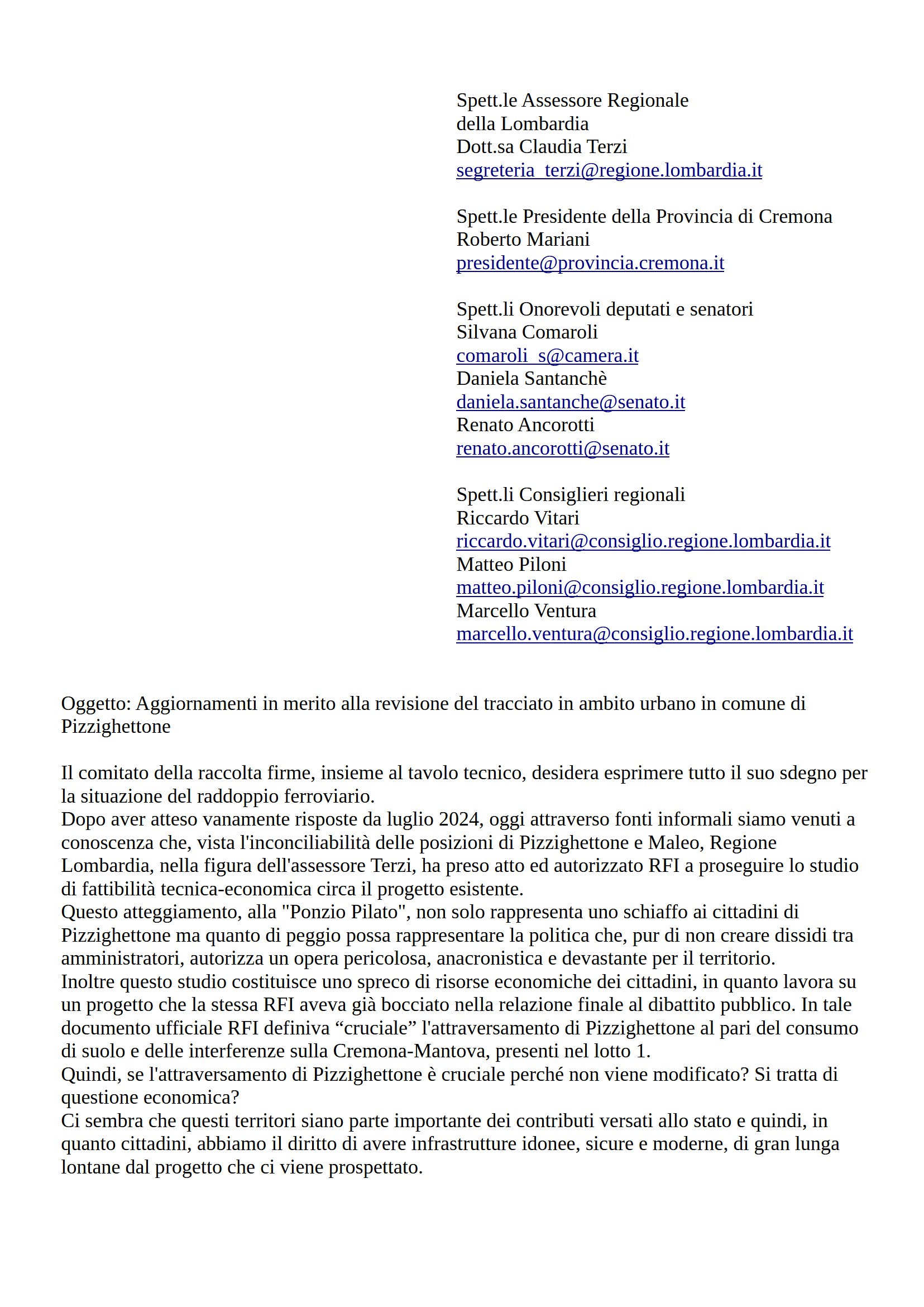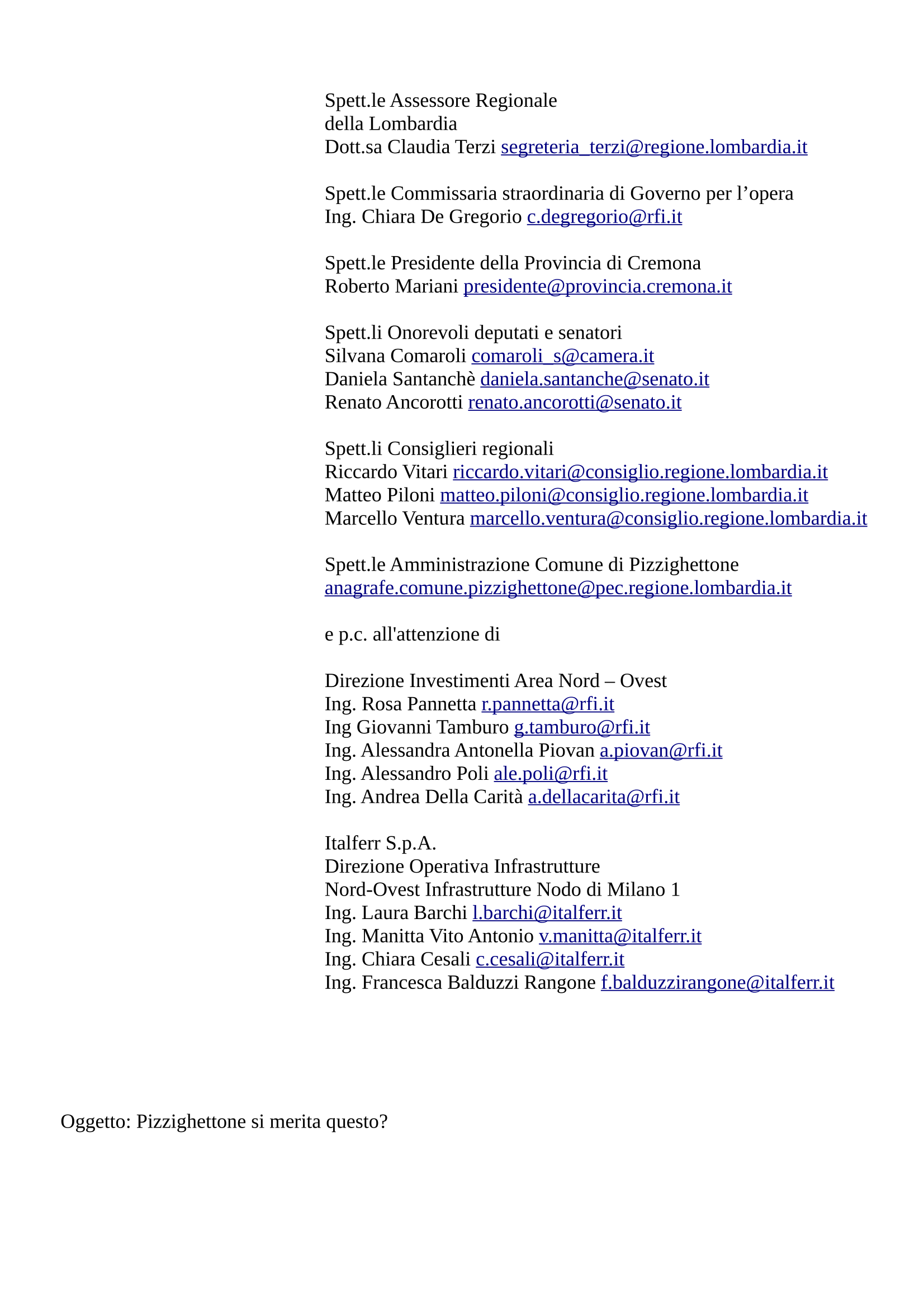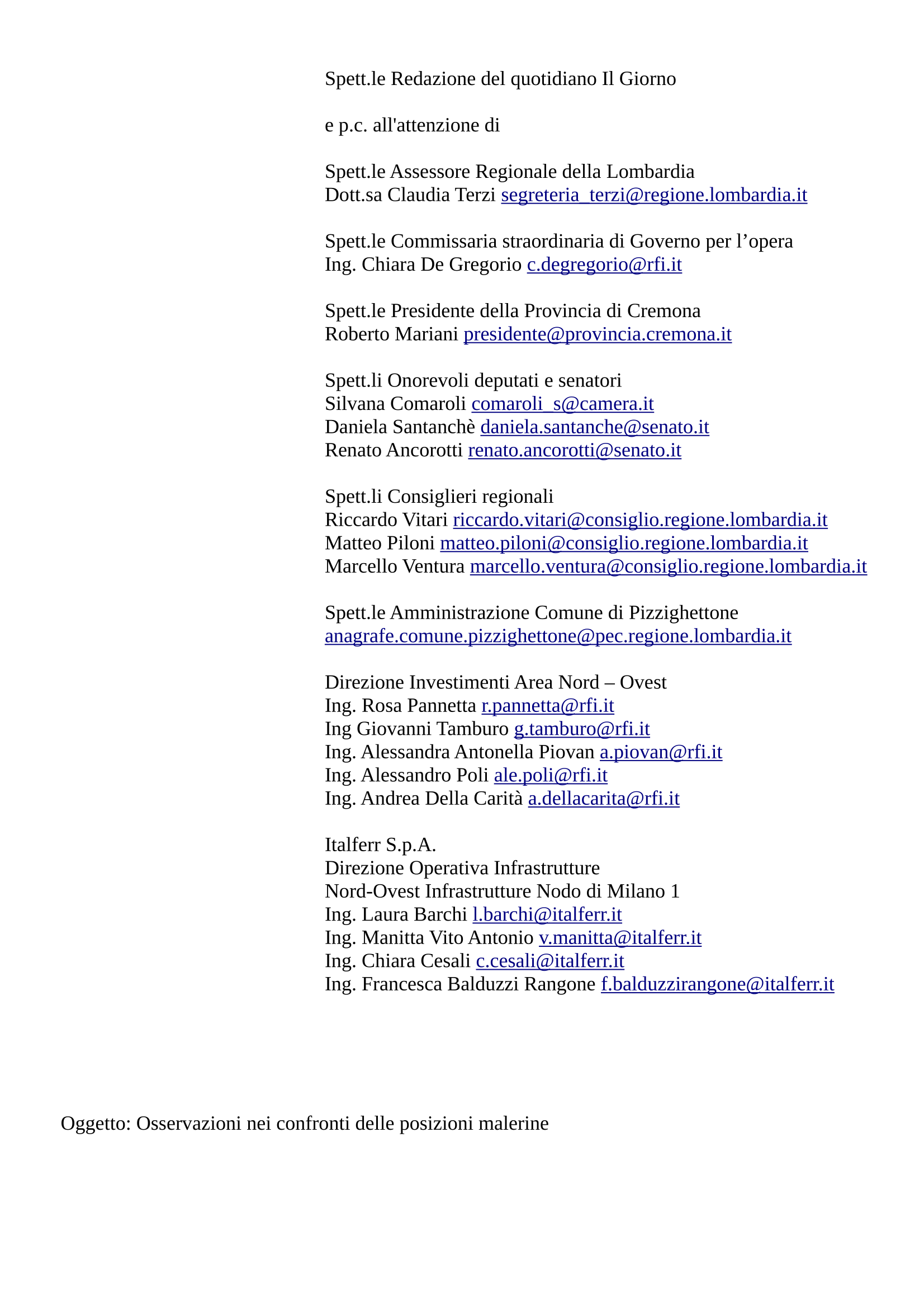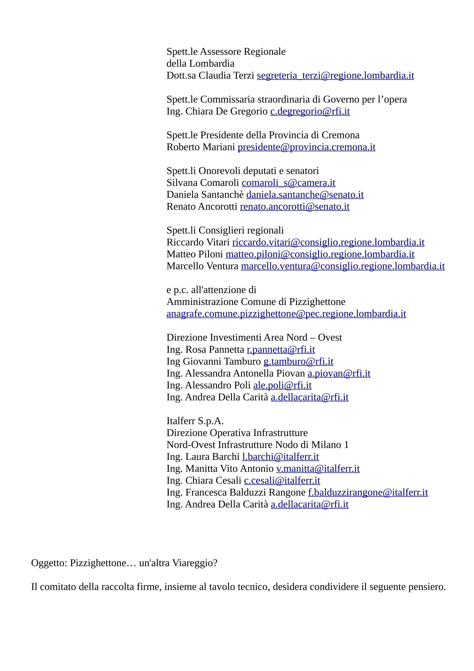 Abbiamo pensato di indirizzare le nostre preoccupazioni e osservazioni: