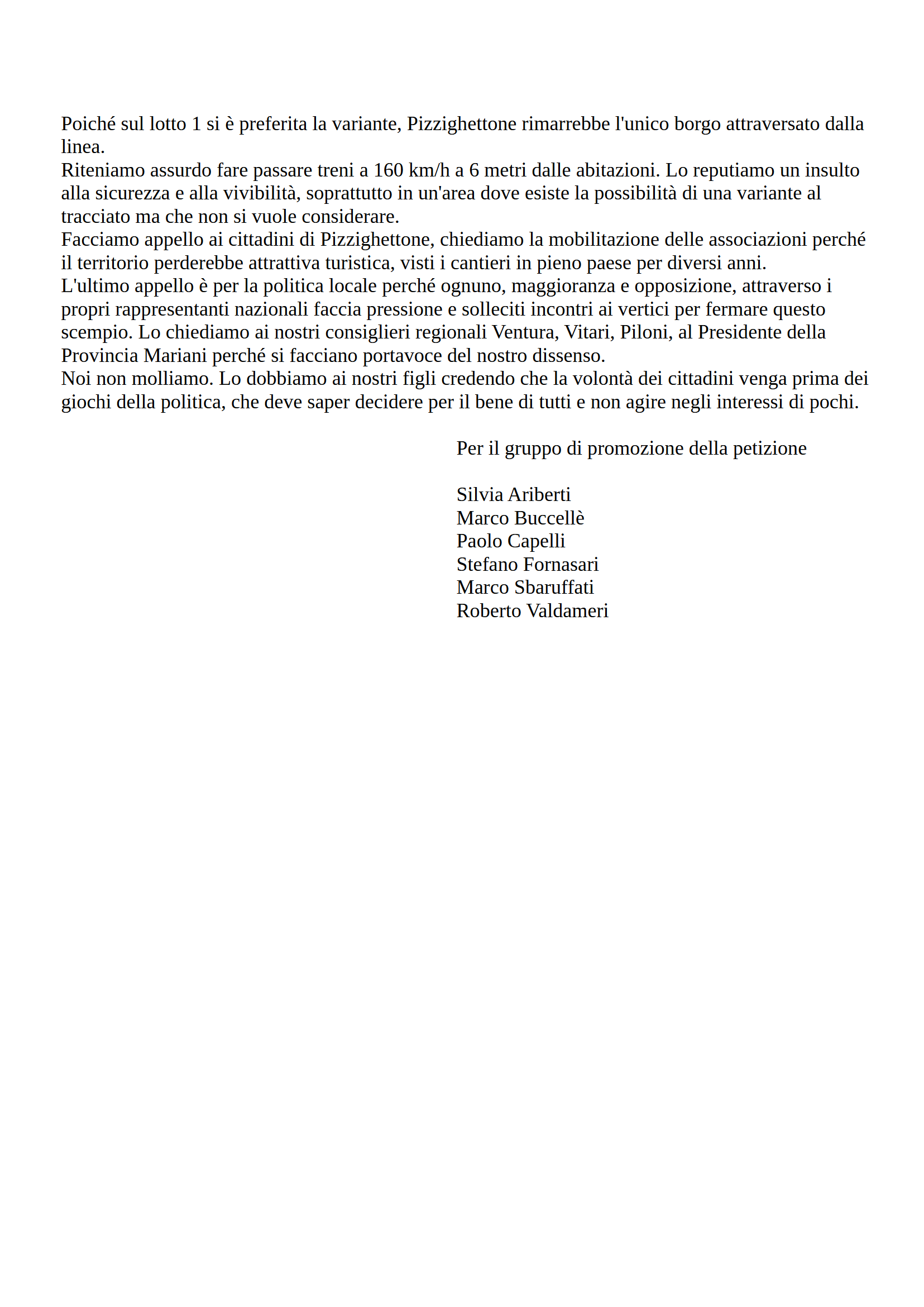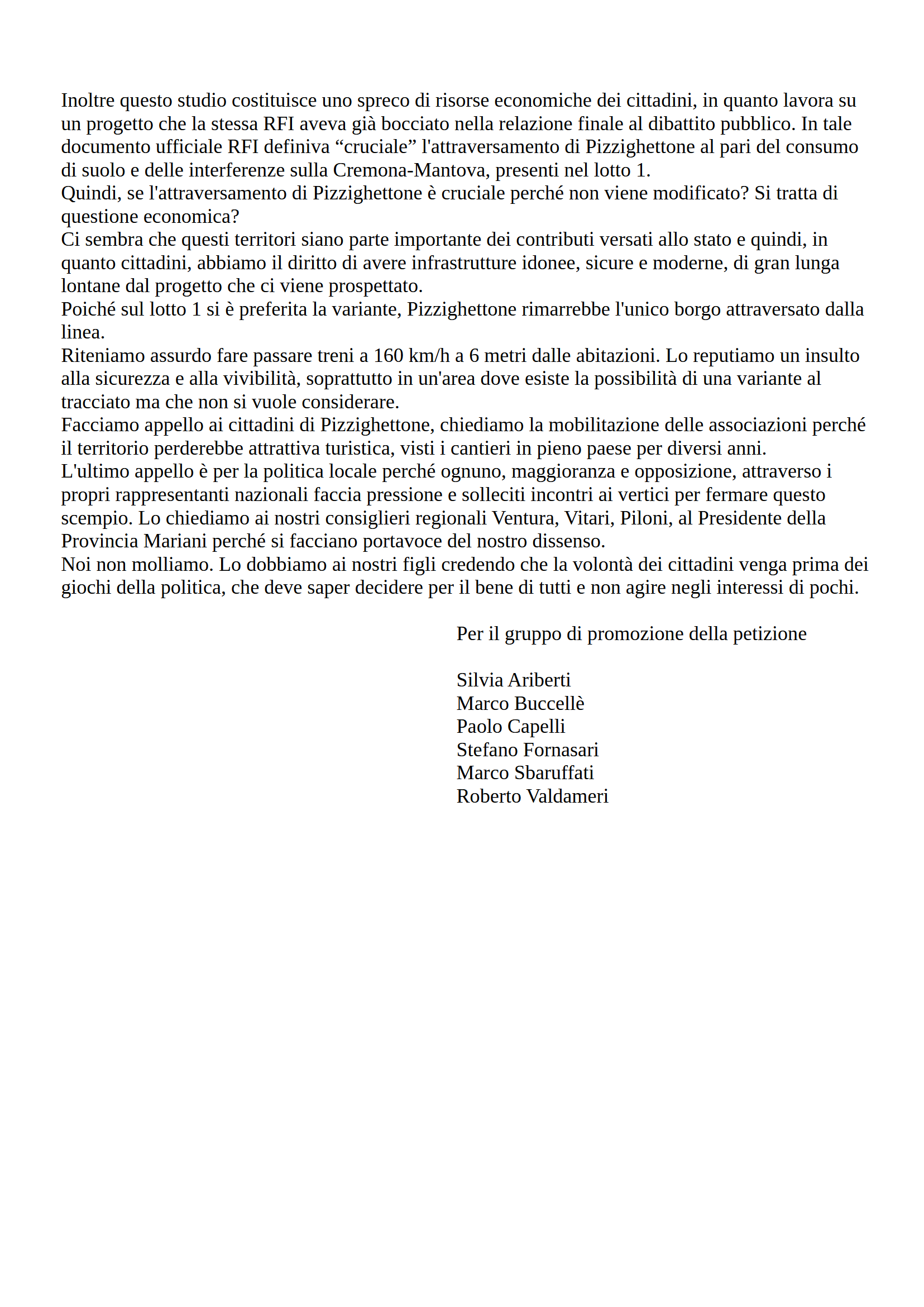 Al termine del dibattito pubblico il gruppo promotore di questa raccolta firme sta continuando il suo impegno nel monitorare l'andamento del progetto e nel continuare con fermezza a sostenere le richieste che i sottoscrittori hanno condiviso.